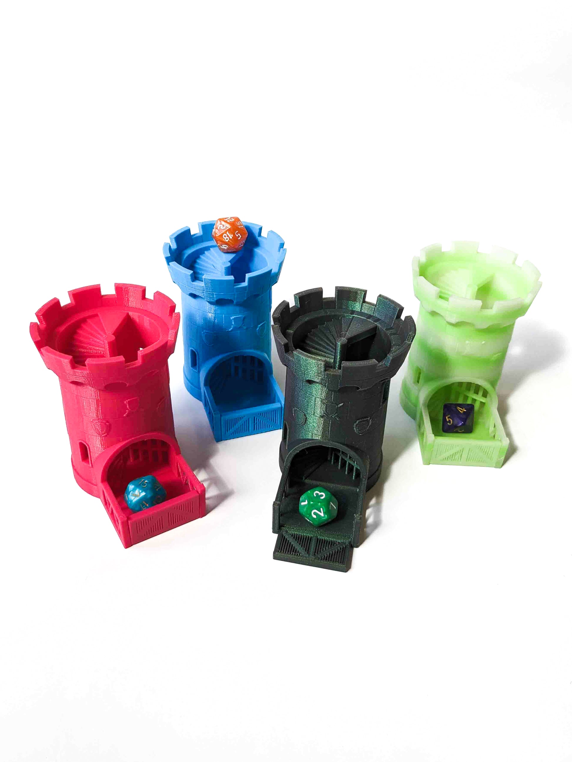 Never ruin a roll again with this castle-shaped dice tower featuring a movable drawbridge. This dice tower is 3D printed using recycled PLA and is available in multiple colours. Lightweight, durable in use, and ready for countless adventures at the game table. Sustainable, playful, and a true eye-catcher for any RPG or board game night.