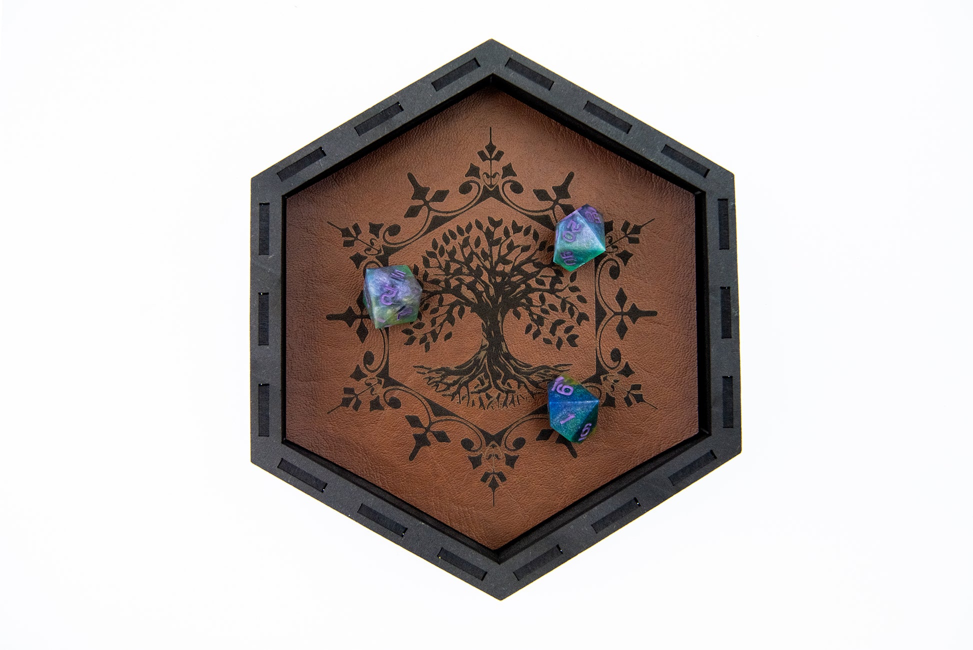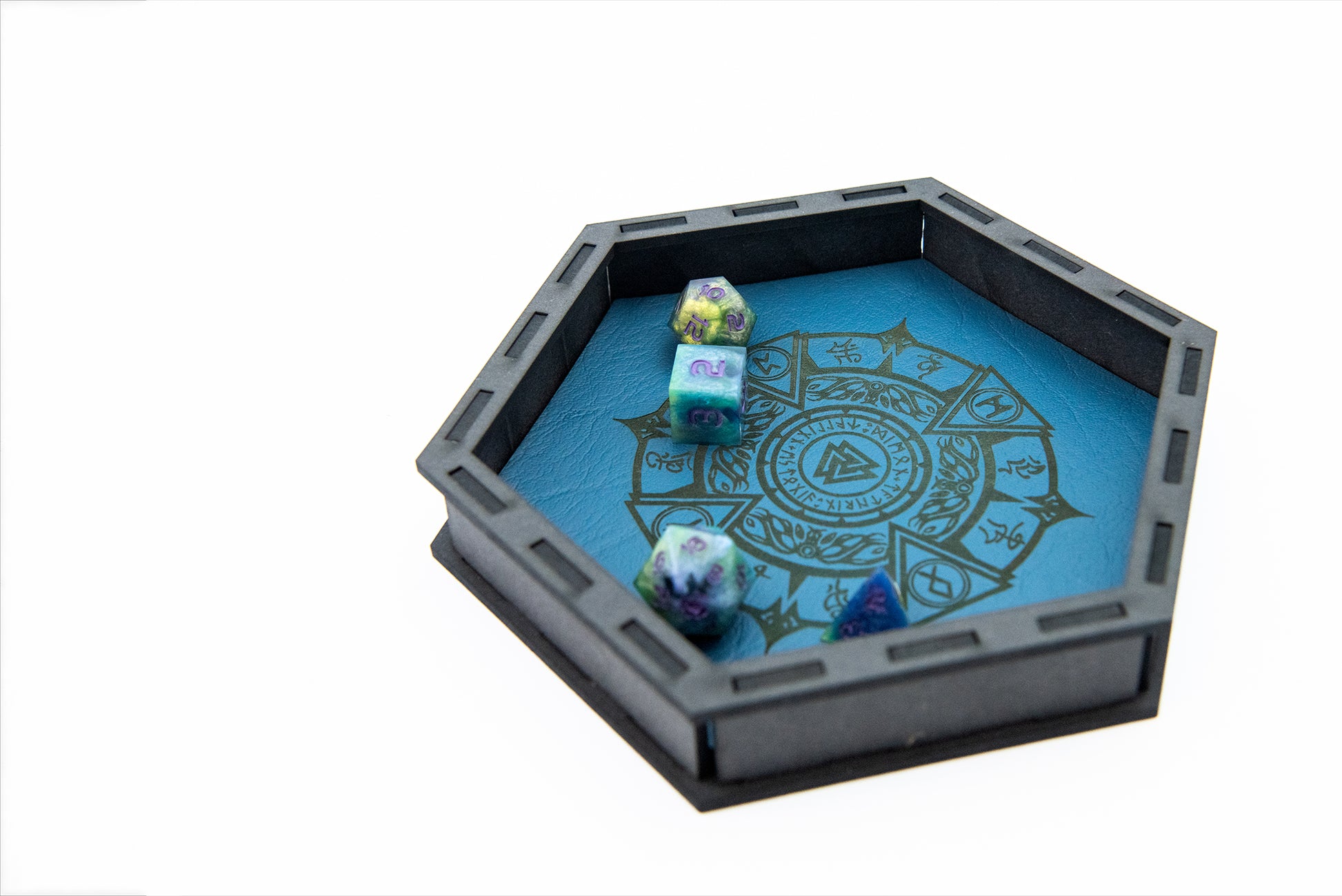 Keep your rolls contained and your setup stylish with this lasercut wooden dice tray, featuring a vegan leather inlay with engraved design. Choose from four colours and three patterns to match your character or campaign. Durable, elegant, and perfect for any RPG or board game night.